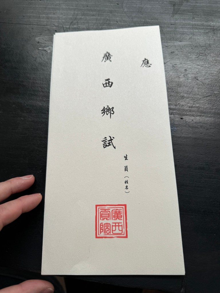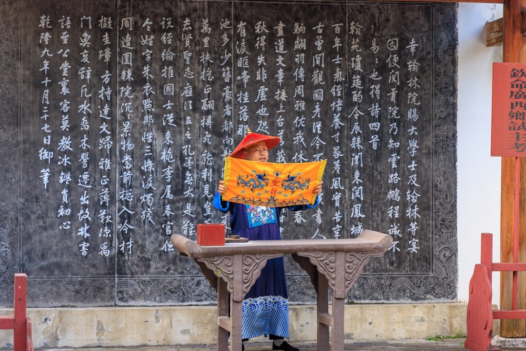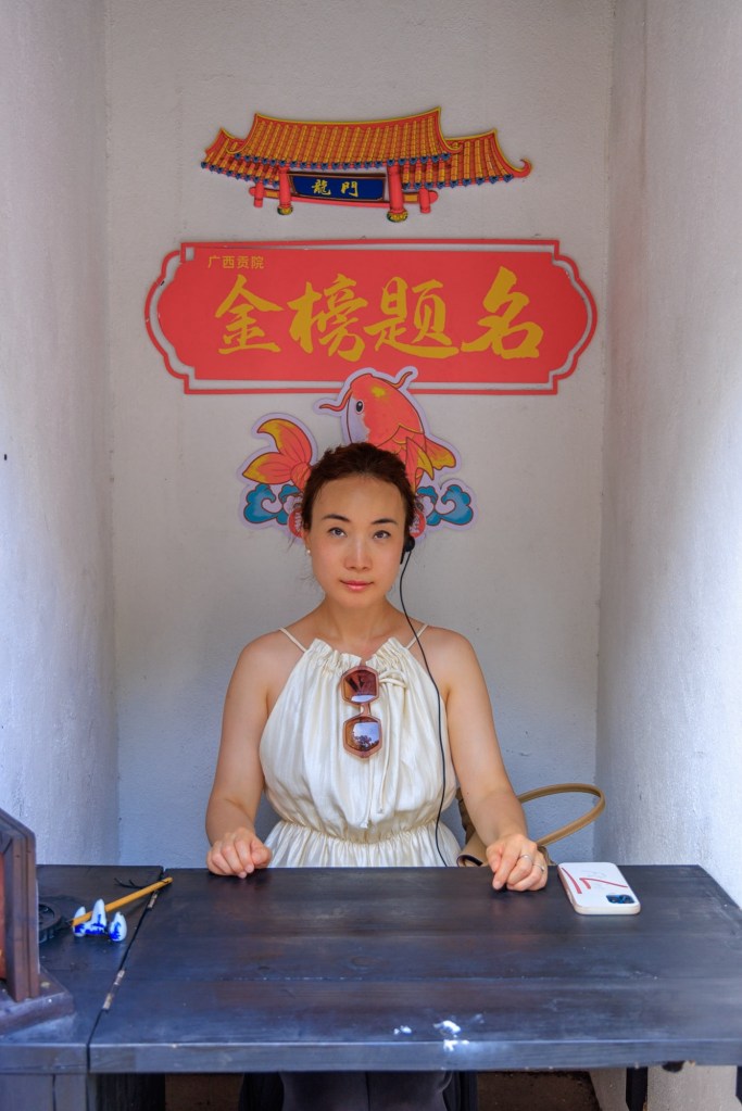 Ziemlich buntes Programm bei der Führung hat Spass gemacht. Erst haben wir ein Glücks Schriftzeichen mit der speziellen Farbe aus Guilin „gemalt“, dann haben wir eine Art Wunschband an die Gravur unseres Schutzheiligen (wurde durch unser Geburtsjahr bestimmt !) gebunden, in den Höhlen unter dem Palast … dann diese kleinen Unitests.