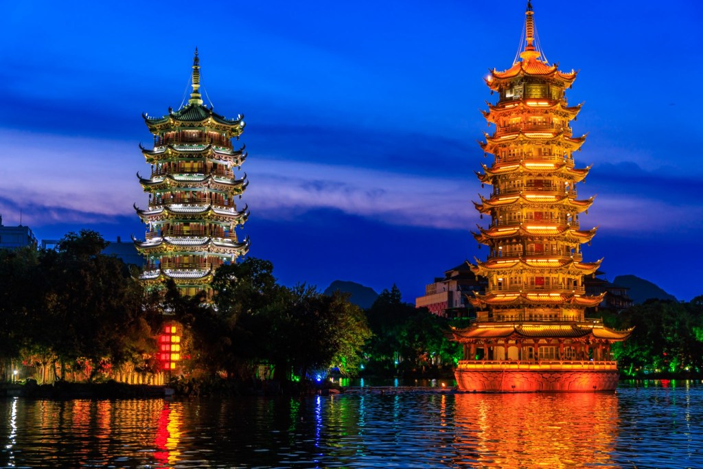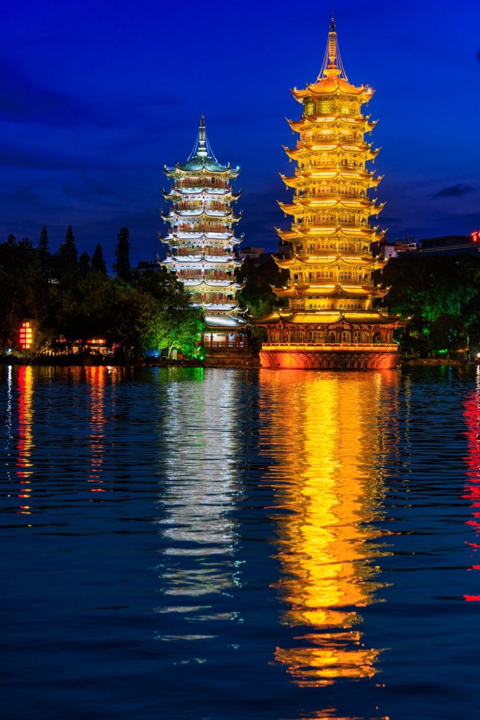 Nach dem Prinzenpalast und ganz bewusst mit dem Einsetzen der Dämmerung sind wir dann zum „Zedernsee“ dort befindet sich ein weiteres Wahrzeichen Guilins, die Sonne und Mond Zwillingspagoden.