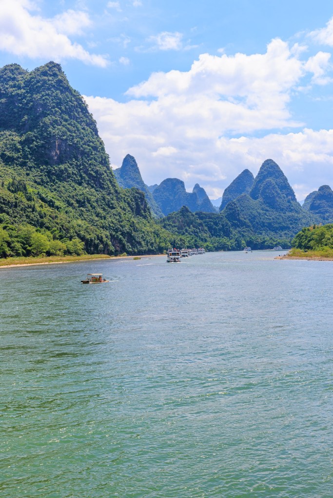 Es fährt tatsächlich zur gleichen Zeit eine ganze Flotte von Schiffen wie in einer Parade den Fluss entlang nach Yangshuo, jeden Tag zur gleichen Zeit … und von Yangshuo fahren die dann alle direkt wieder leer zurück. Den Rest des Tages fahren nur die kleinen Bambusflösse den Fluss entlang.