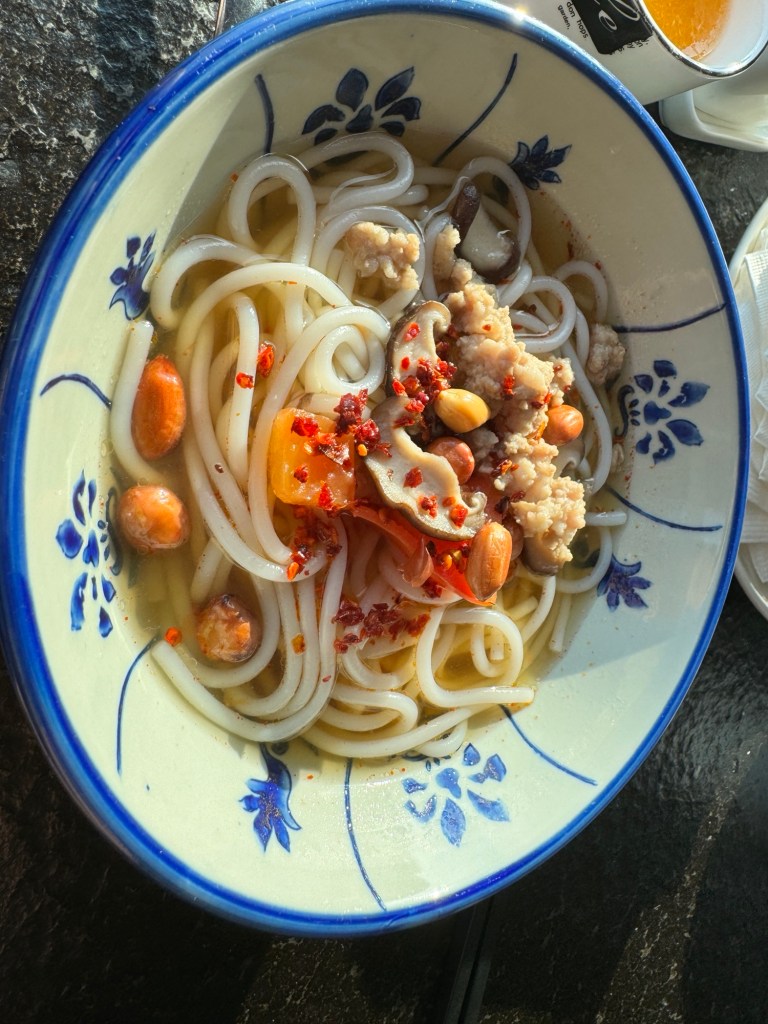 Da wir sehr für abgeholt wurden habe ich es vorher sogar noch zum Frühstück geschafft, mit der letzten Gelegenheit doch noch die original Guilin Reisnudeln gegessen … lecker ! Und die Aussicht aus dem Restaurant im „Aroma and Tea House“ ist echt super !