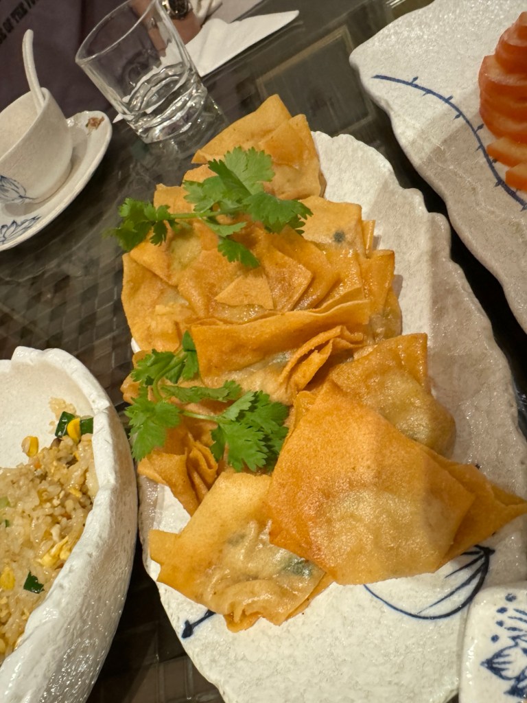Dazu Ente mit Orange …Reis mit Gemüse, gebratene Dumplings und Pfefferschoten + Nachtisch !