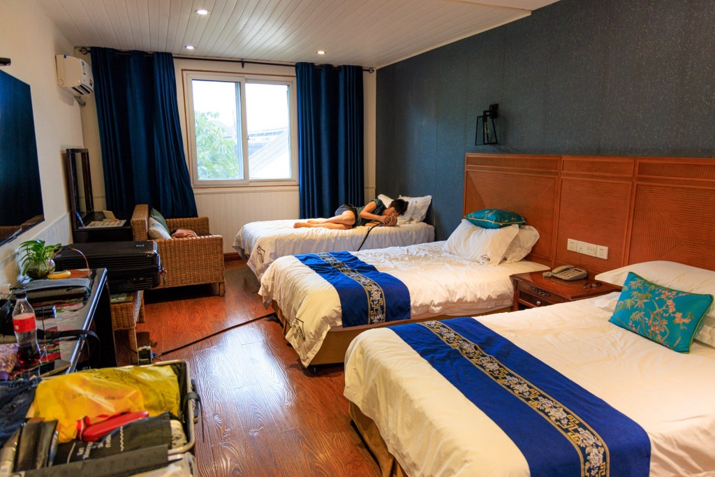 Es ist ok, sauber und gemütlich … natürlich im direkten Vergleich zu dem Mega Appartement in Chongqing oder dem tollen Resort Zimmer in Yangshou eher „Spartanisch“ aber wir mögen es und das Feeling im Hotel hebt das kleine Zimmer wieder auf … Huas Freundin ist direkt in ein benachbartes Hotel „geflüchtet“ und meine Cousine wird auch morgen dorthin umziehen … dies ist ein Hotel im modernen Stil, würden wir bei uns eher als Business Hotel bezeichnen. Wir ziehen stattdessen im gleichen Hotel morgen in ein größeres Zimmer um … das „alte“ Hotel halten wir bei !