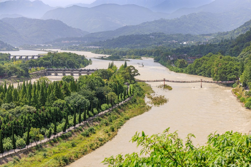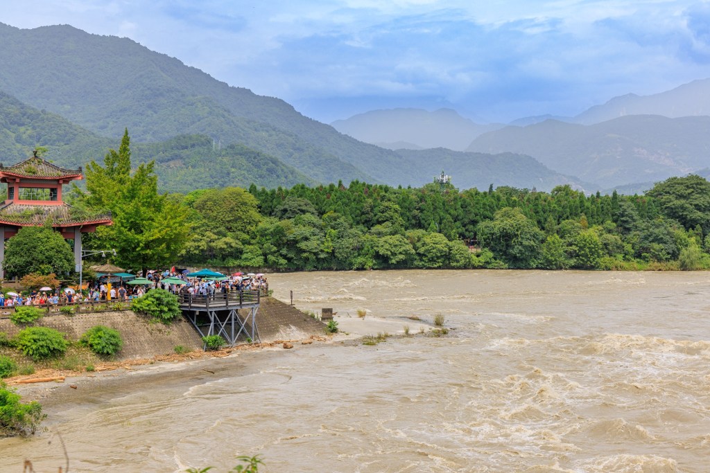 Das ganze ist hochgradig faszinierend: Vor 2300 Jahren haben die schlauen Chinesen dort ein System aufgebaut das sich selbst reguliert ohne gesteuert oder geregelt werden zu müssen. Im Prinzip teilt es den Min Fluss auf: Bei „normalem“ Wasserstand fließen 40 % des Flusses den Fluss hinunter und 60 % in die Bewässerung für die Felder von Chengdu … dabei wird das ganze so aufgeteilt das die Sedimente im Fluss bleiben und in die Bewässerung nur „sauberes“ Wasser fließt. Bei Hochwasser ändert sich die Strömung und 60 % des Wassers fließen den Fluss hinab und nur 40 % gehen in die Bewässerung … das alles funktioniert nur durch clever angelegte „Sandbänke“ aus Kies und einer schlauen Form des „Fischmaules“ wo das Wasser geteilt wird.